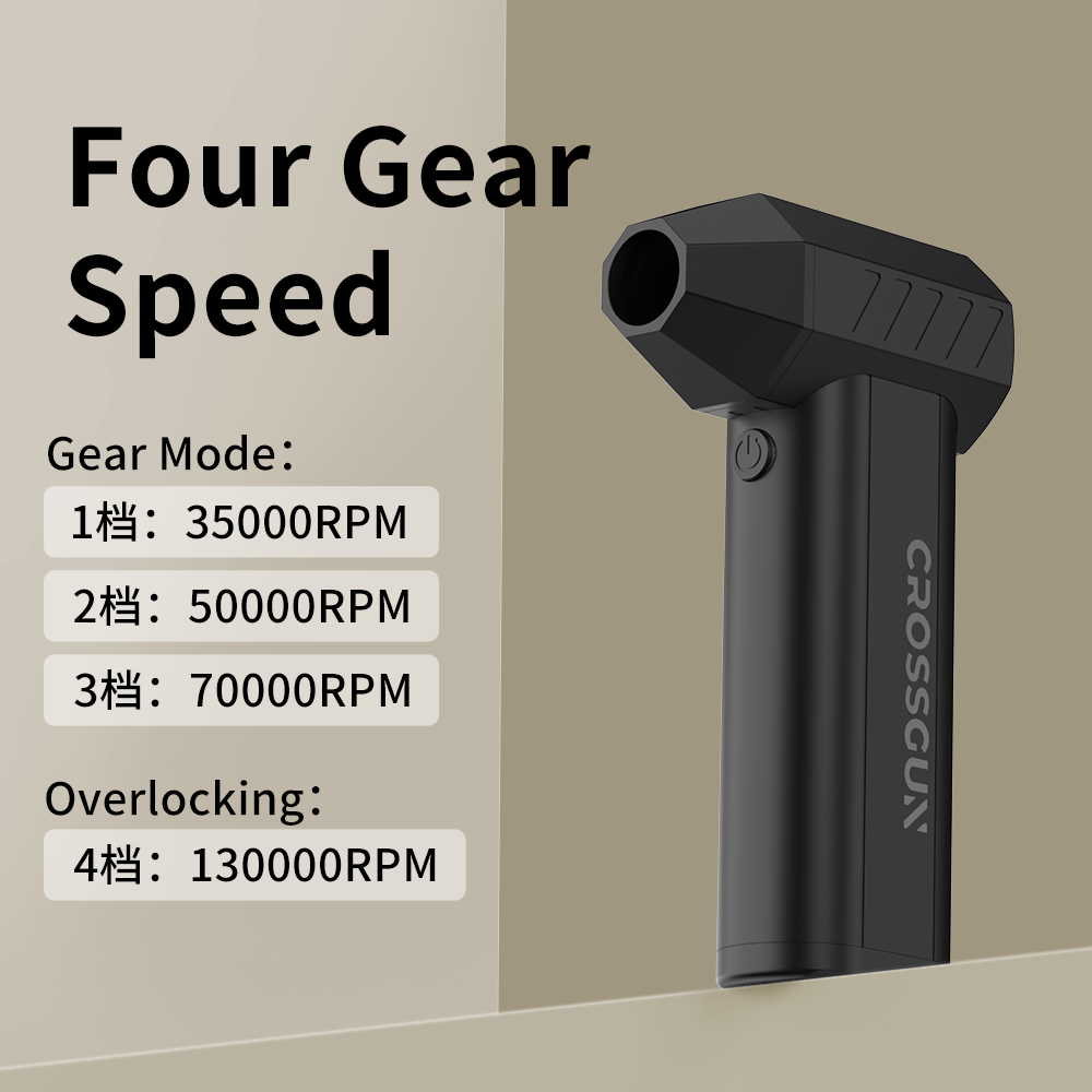 This turbofan has four fixed wind speeds,The first gear speed is 35000 rpm,The second gear speed is 50000 rpm,The third gear speed is 70000 RPM.The fourth gear has a maximum speed of 130000 ± 10% revolutions per minute.Attention: Only the first gear of 35000 rpm can be used during charging (we have strictly designed it, so you can use it with confidence).
